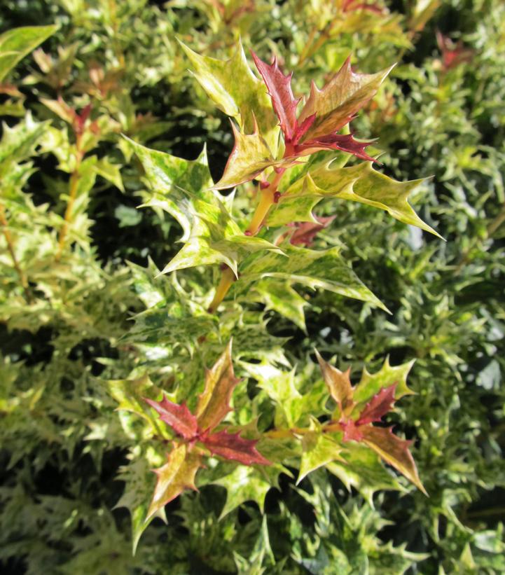 Description: Dense growerEvergreenPyramidal shapePrickly, holly-like foliageGold-flecked and cream variegationEasy to care forNew foliage has a reddish-bronze cast